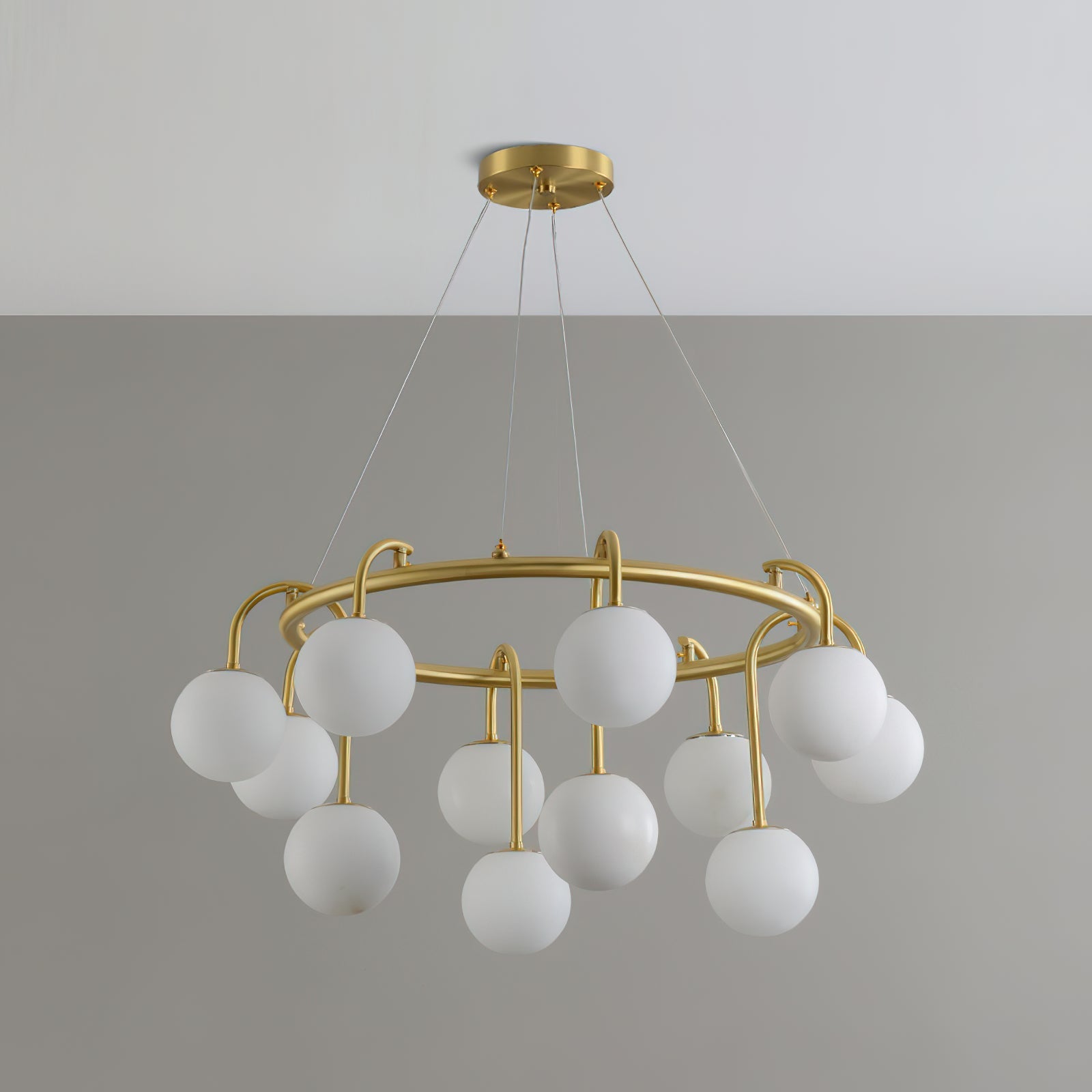 The Mayton Chandelier brings retro-chic symmetry to modern interiors, featuring a warm brass frame crowned with cloud-like alabaster globes. Each spherical shade softly diffuses the light, creating an inviting glow that feels refined yet playful. Available in 12, or 15 heads, it’s a statement centerpiece for dining rooms, living spaces, and larger entryways.